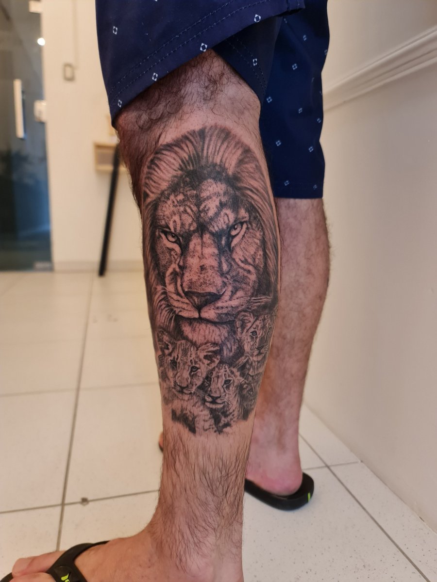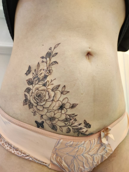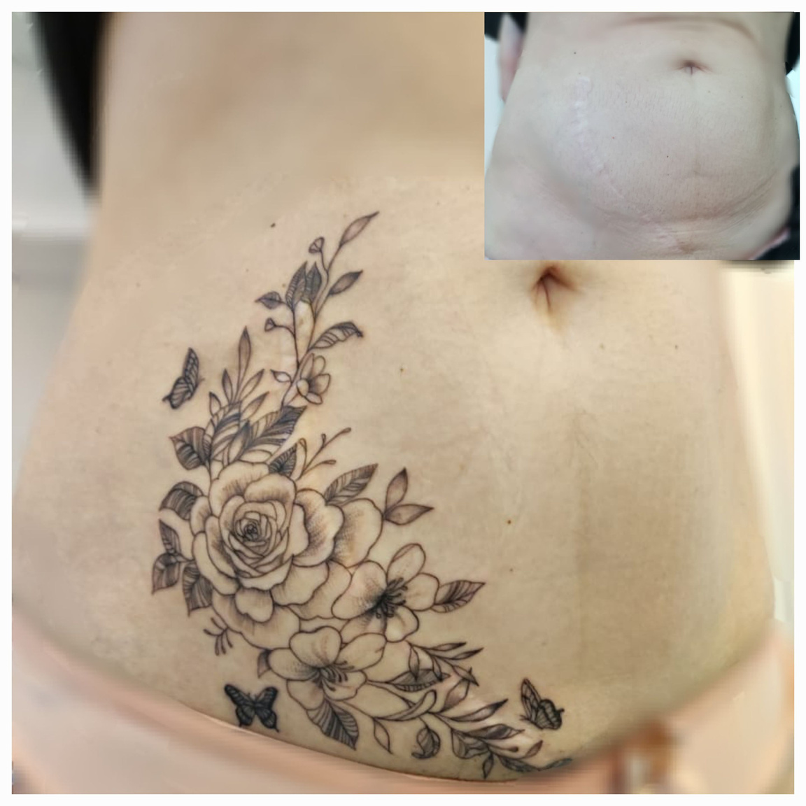 Trabalha com camuflagem de cicatriz com tatuagem artística, realismo preto e cinza e tatuagens íntimas.